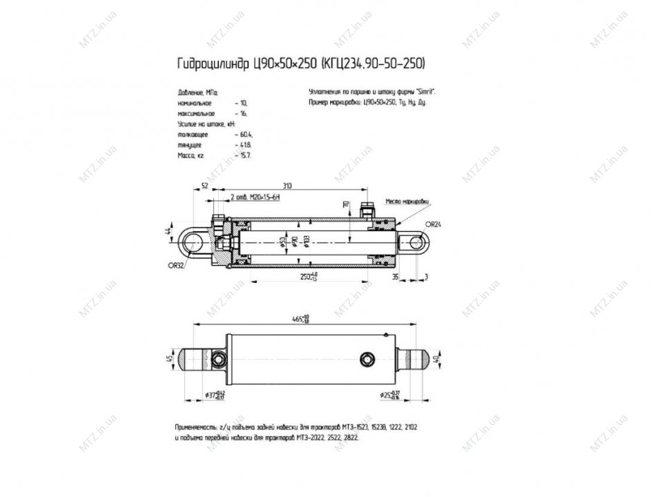 Гидроцилиндр заднего навесного оборудования устанавливается на тракторах МТЗ-1523, 2022, переднего навесного оборудования МТЗ-3022, 3522. L=465 по центрам крепежного уха, D.нар=103, D.уха=37мм/25мм
